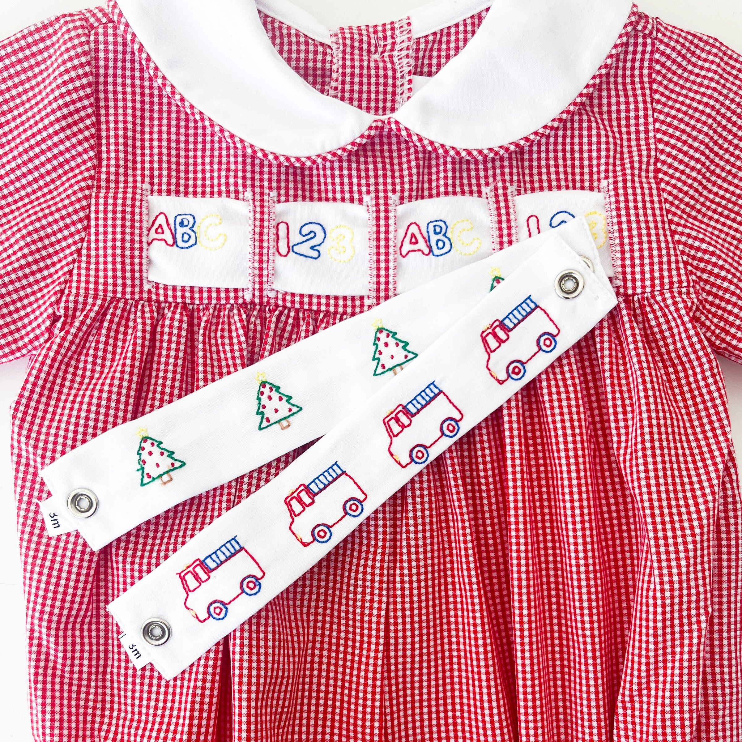 Our Noah Ribbon Bubble is a Lullaby Set classic. This timeless bubble is back this season in Ridgeland Red Minigingham with white piping. The interchangeable ribbon detail that weaves across the front of the bodice makes this a versatile bubble appropriate for school days, everyday, Christmas.