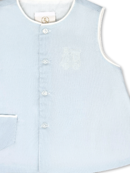 The top buttons up the front and features crisp white piping along the small front pocket, neckline, and arm openings for a polished finish. The button up top showcases a delicate train embroidery.The matching diaper cover is detailed with buttons making this set perfect for special occasions or everyday wear.