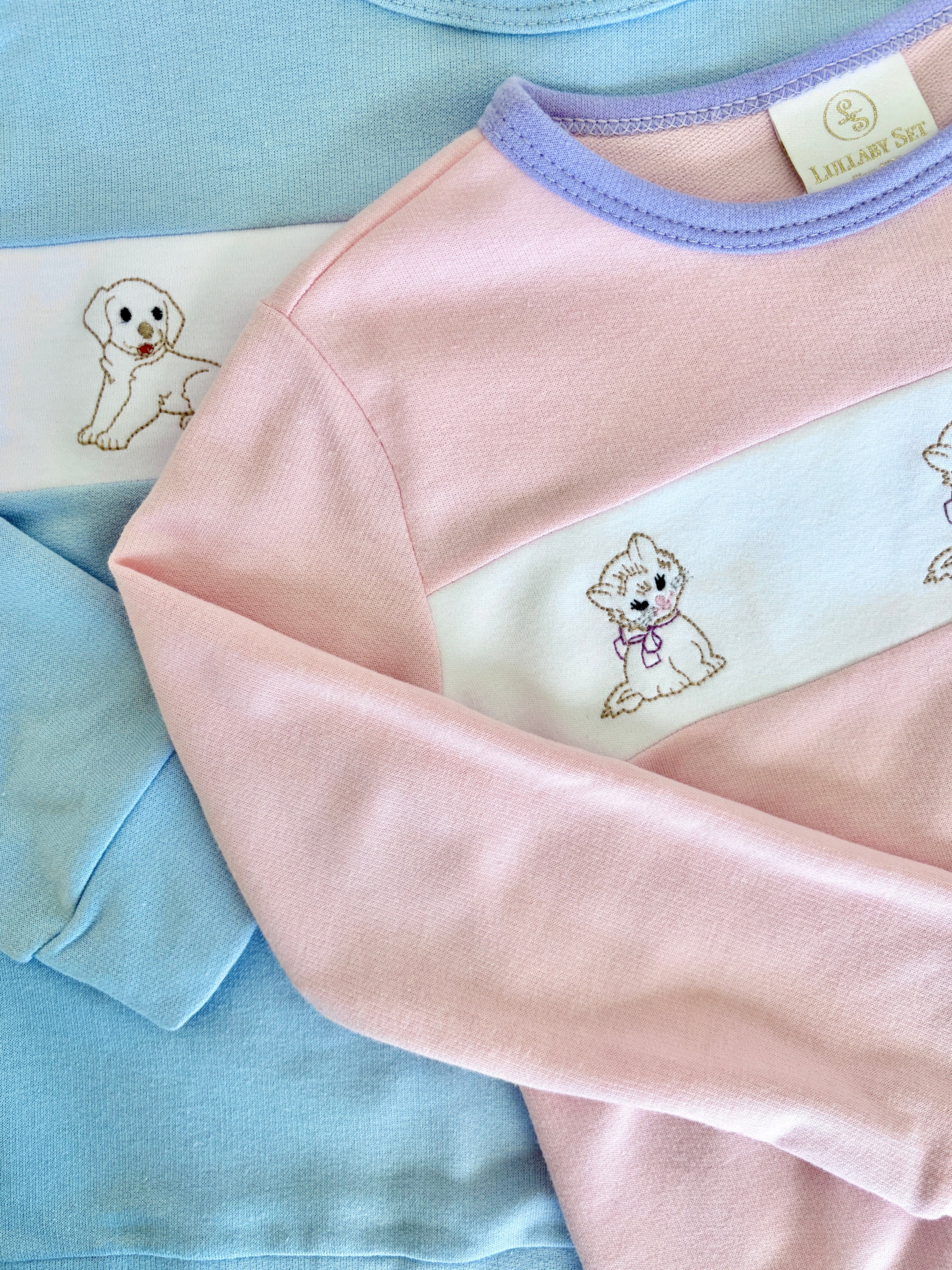 The top features an adorable embroidered puppy motif —just the right touch of whimsy for your little guy. Paired with coordinating Bakersfield Blue pants, this set is as practical as it is precious.