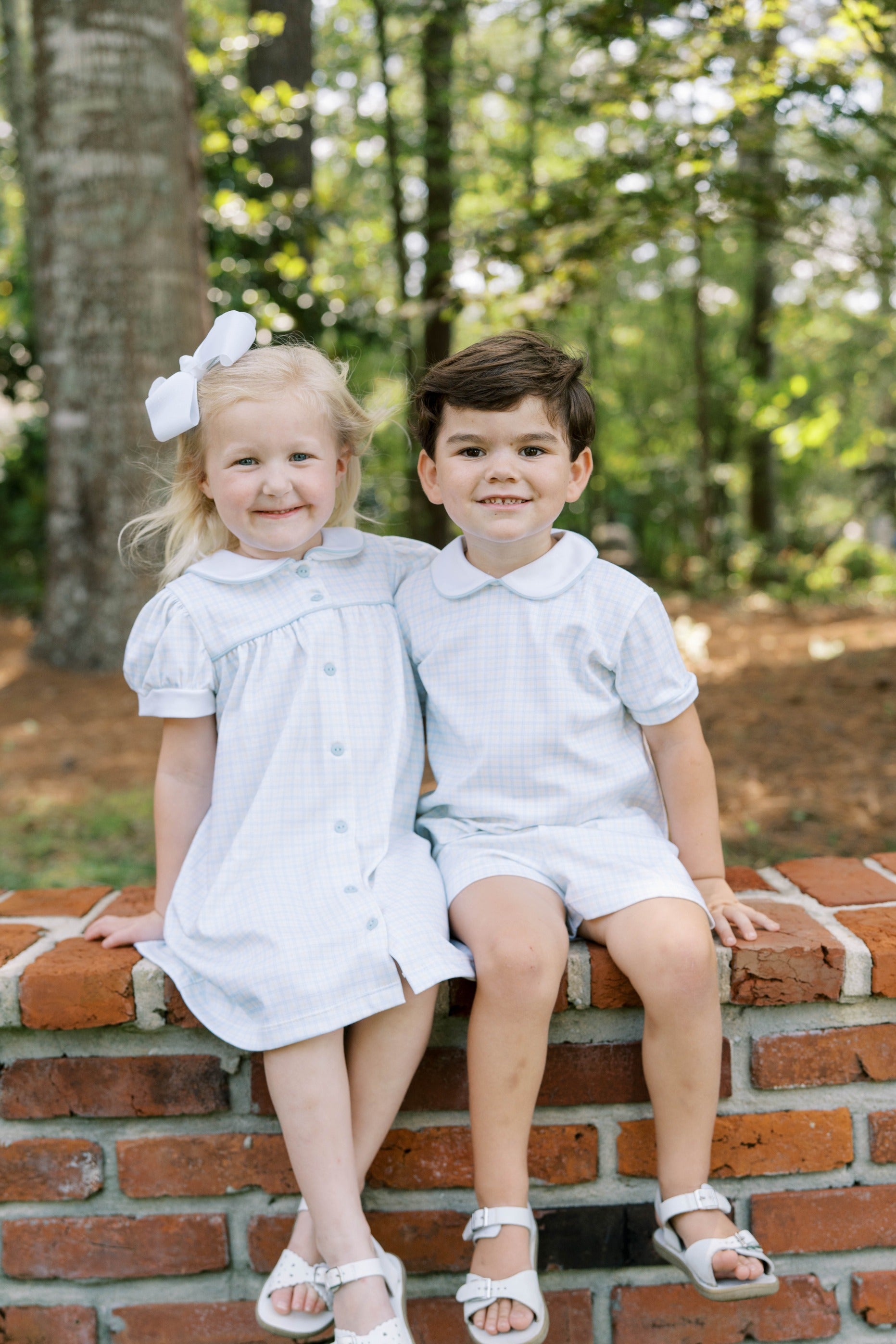 Sweet and classic, the Breccan Dress in charming Cornflower Check is a perfect choice for any occasion. Featuring delicate puff sleeves and a crisp white Peter Pan collar trimmed with light blue piping, this dress combines timeless details with modern comfort. Blue buttons run down the front for a polished finish, making it ideal for everything from family gatherings to special celebrations.