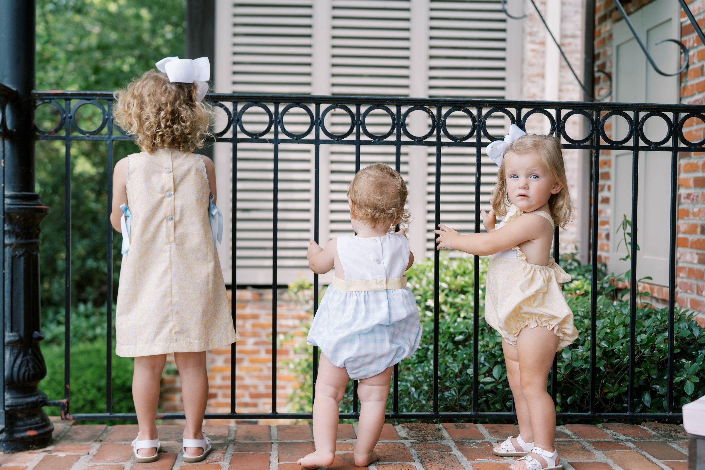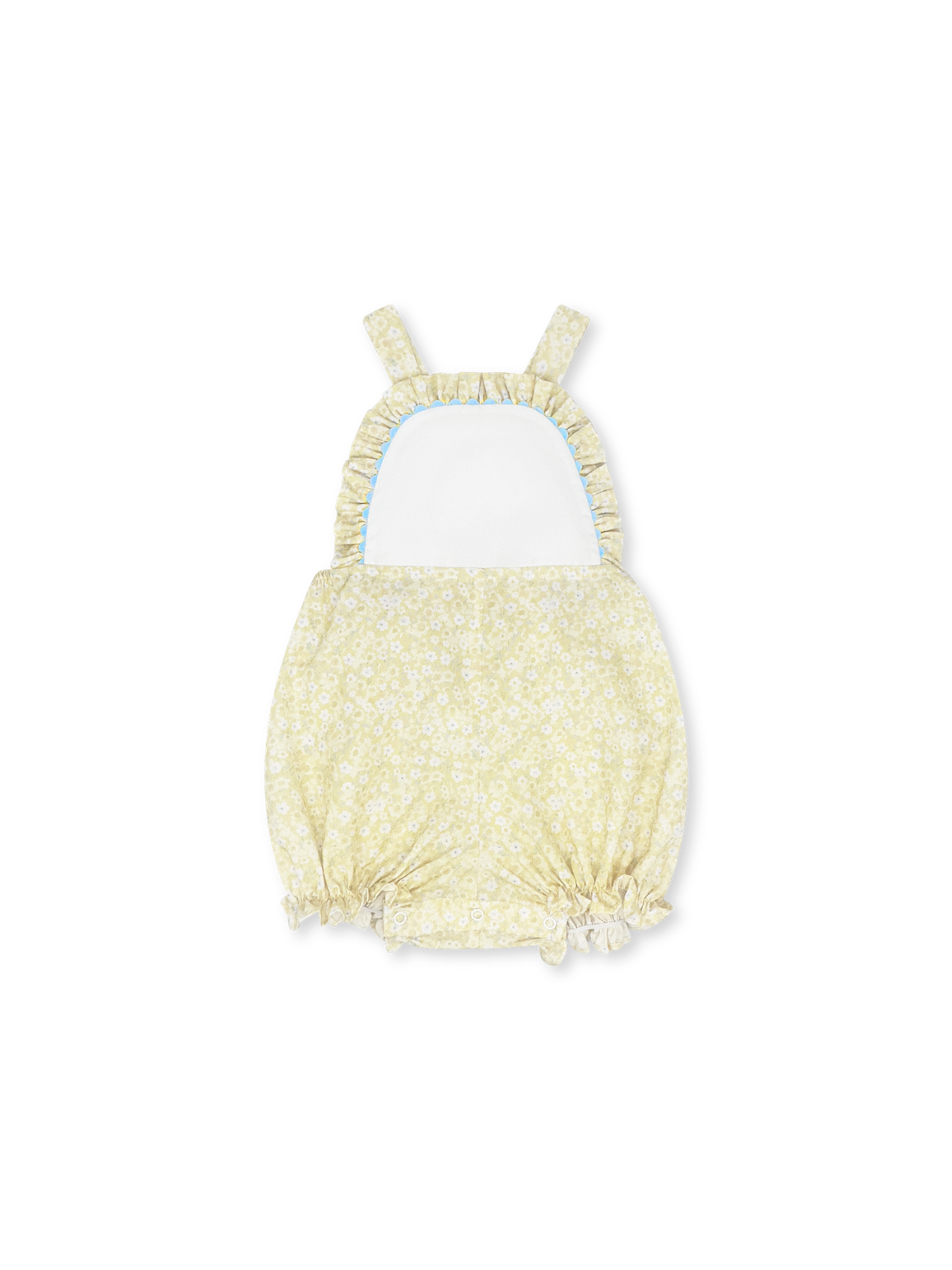 This sunsuit-style bubble features a crisp white top trimmed with ruffled Buttercup Blooms fabric and finished with cheerful blue ric rac for a playful pop. The bubble bottom showcases the full Buttercup Blooms print, making this one-piece both charming and comfortable for warm-weather adventures.