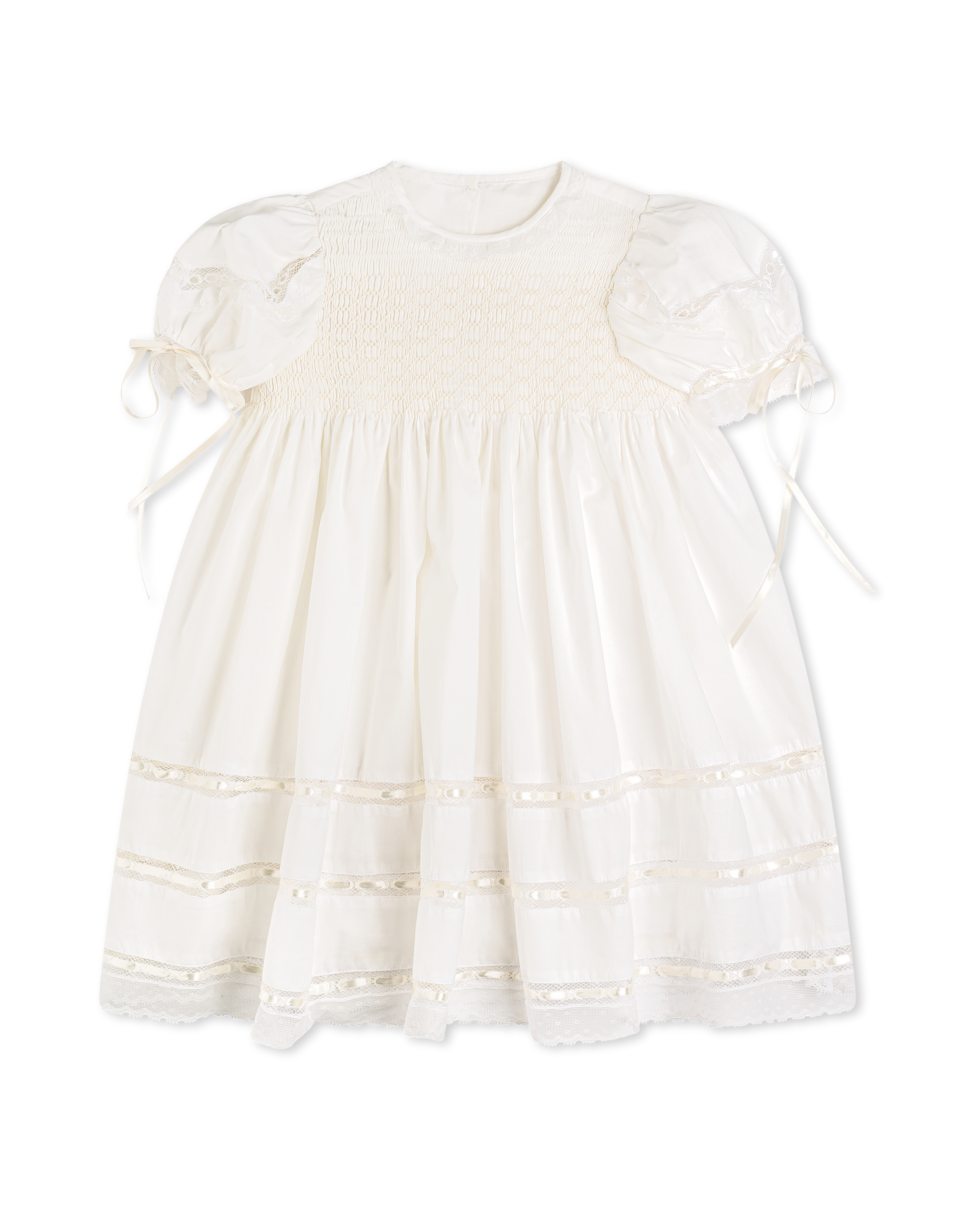 White batiste with ecru smocking, lace trim, and ecru satin ribbon details