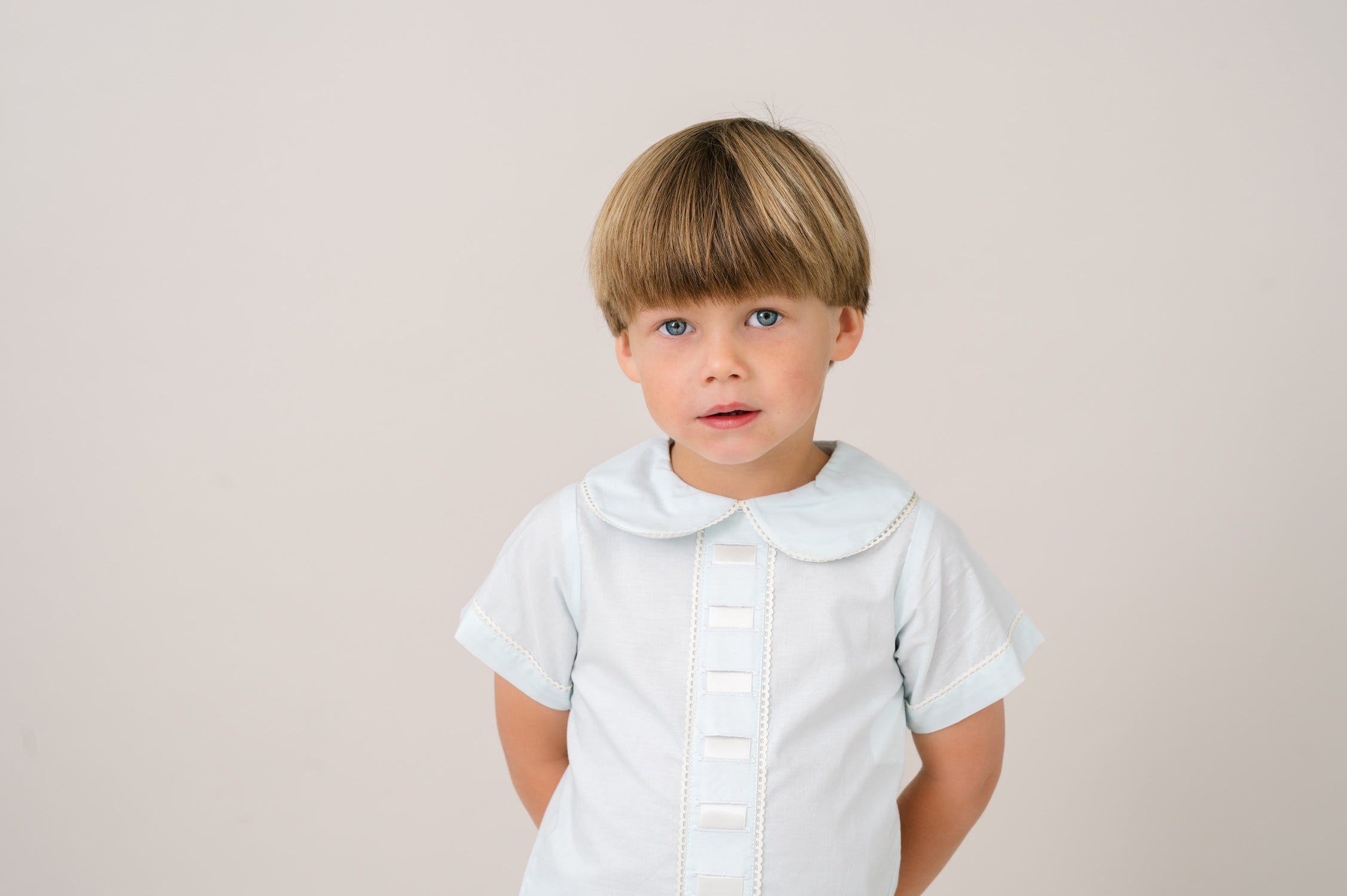 Timeless and charming, the Nate Short Set is crafted from soft Blessings Blue Batiste and features delicate ecru ribbon detailing up the front and an ecru trim beautifully accenting the classic Peter Pan collar, ribbon detail, and the sleeves.