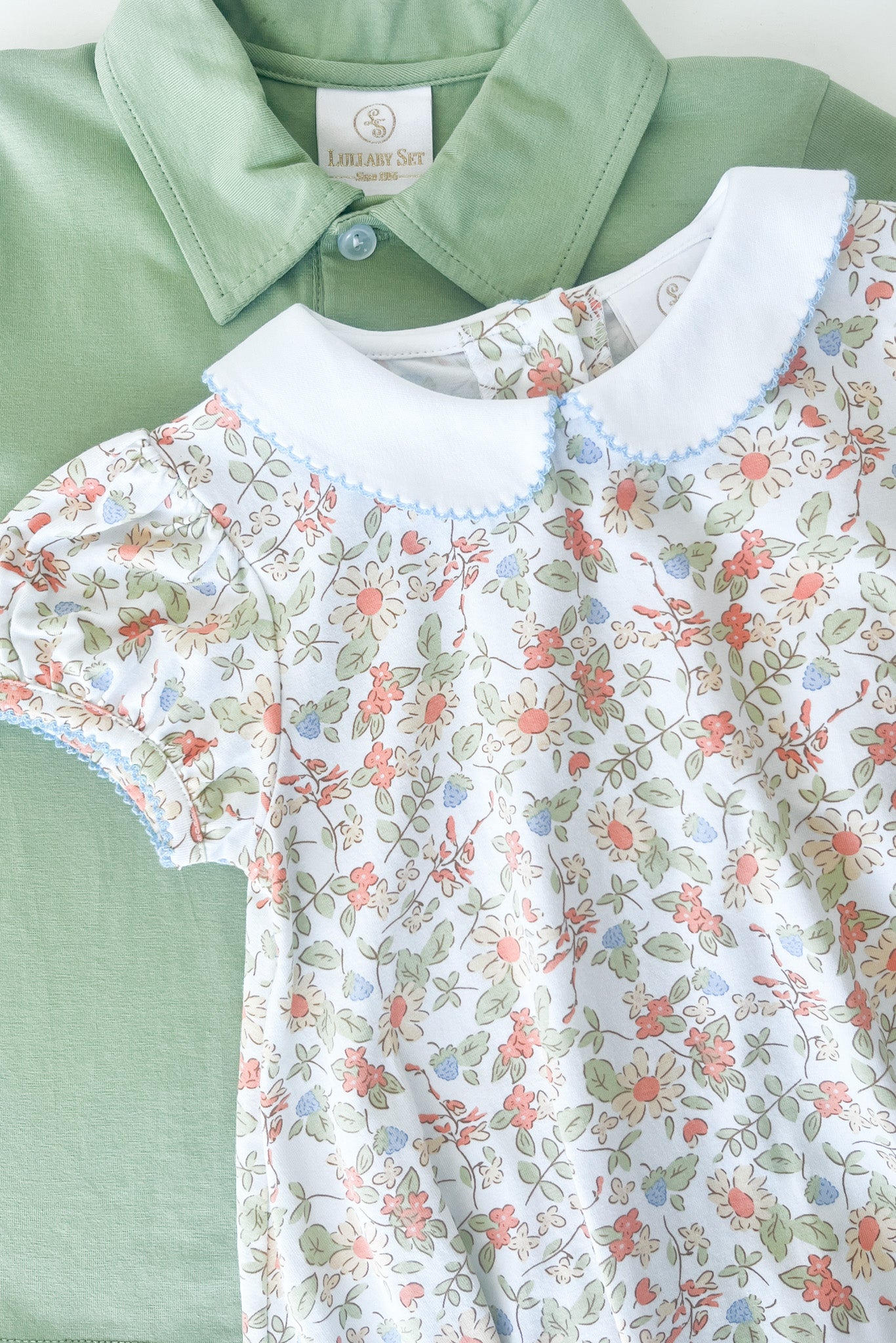 A timeless classic, the Patty Cake Bubble is crafted in our Hearthside Floral Knit and features a crisp white collar with delicate blue picot trim. Perfect for fall days and special occasions.