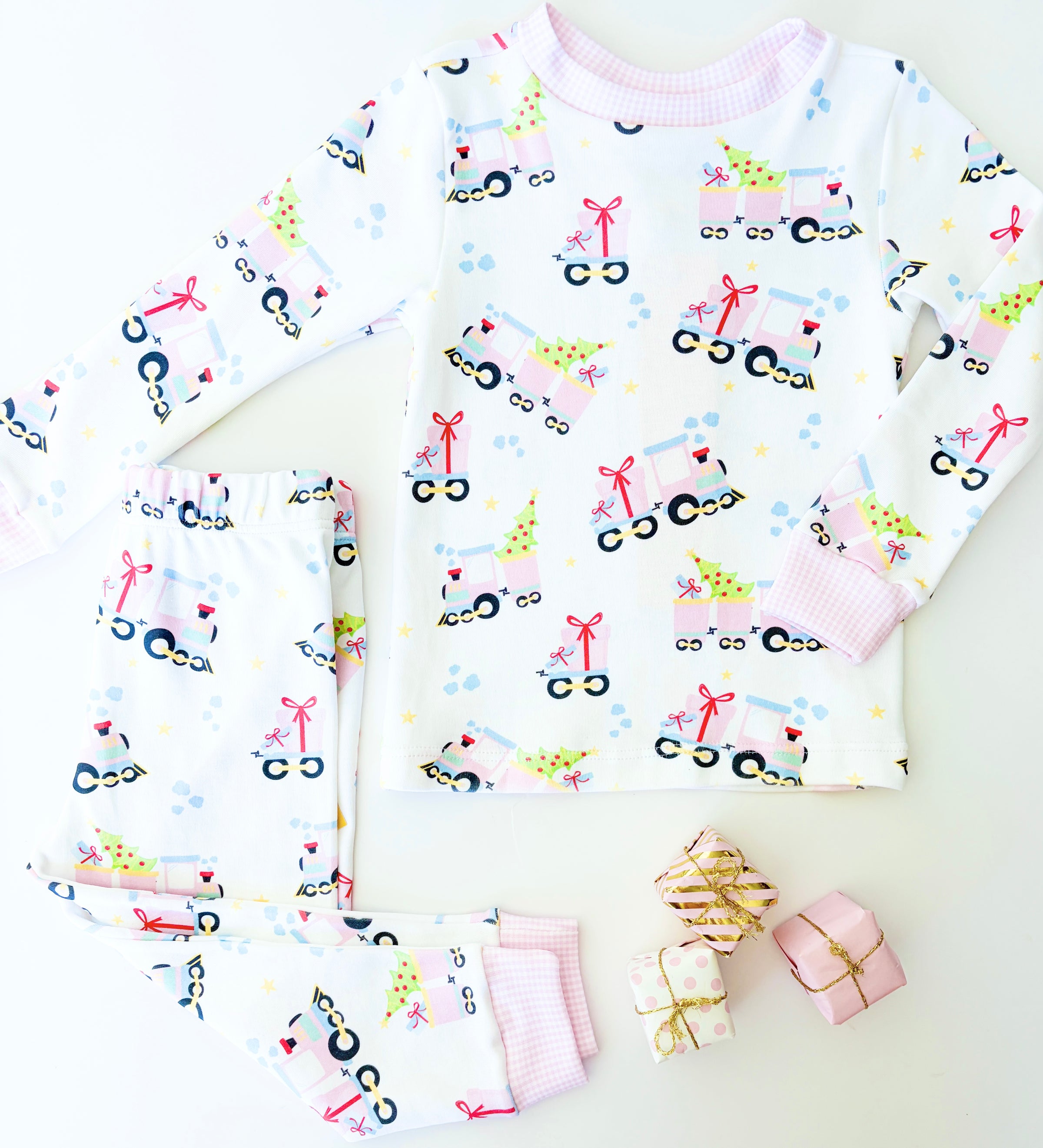 Whether it's a bedtime story or dreaming of Santa, our Sweet Pea PJ Set in the custom All Aboard print with pink minigingham welting and cuffs, adds an extra layer of joy to your child's nighttime routine. It's more than just sleepwear; it's a celebration of the boundless imagination of childhood.
