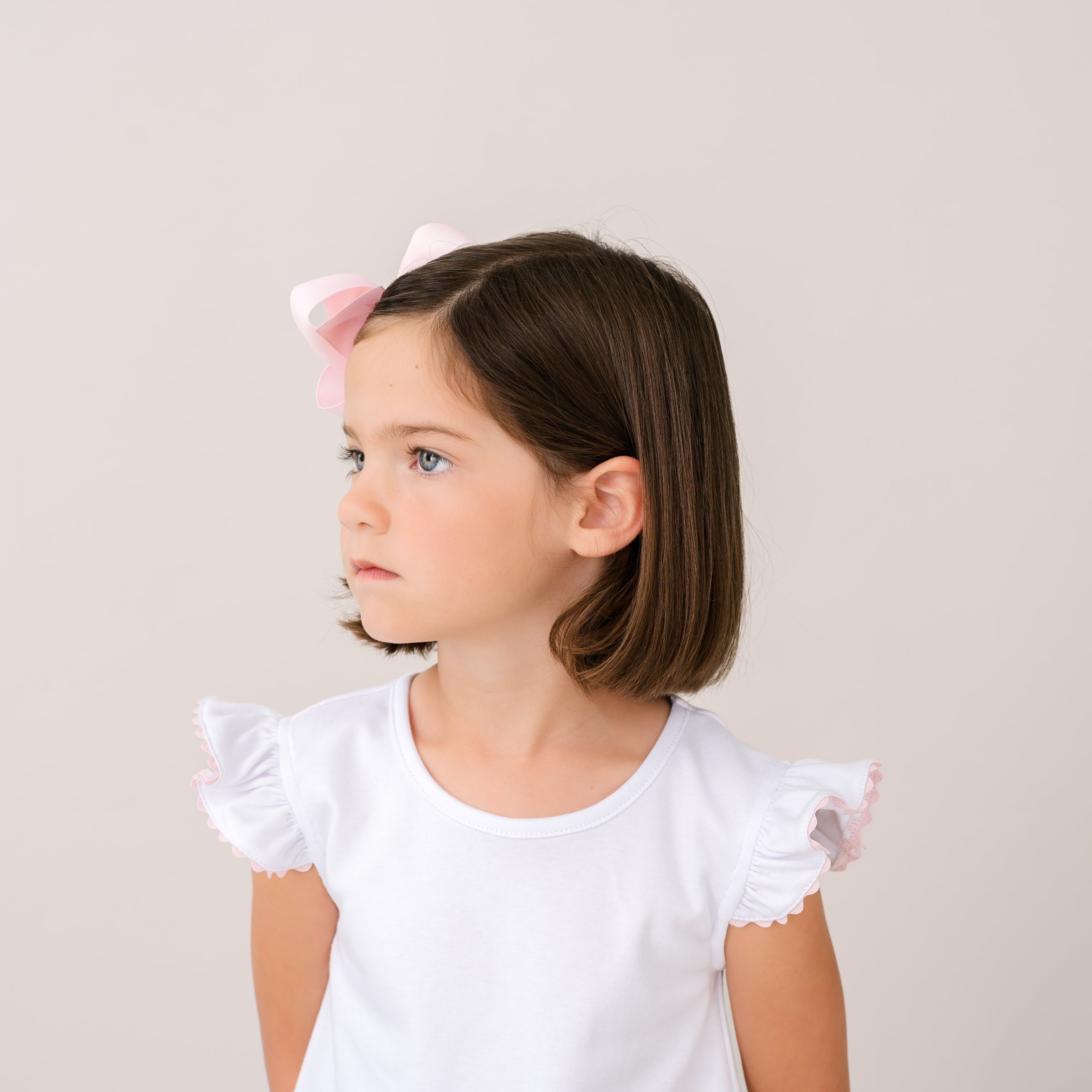 A cute top for all her precious moments! This angel sleeve top in Park white knit with light pink ric rac trim pairs perfectly with shorts or skirts. It is delicate and feminine for a sweet bigger girl look.