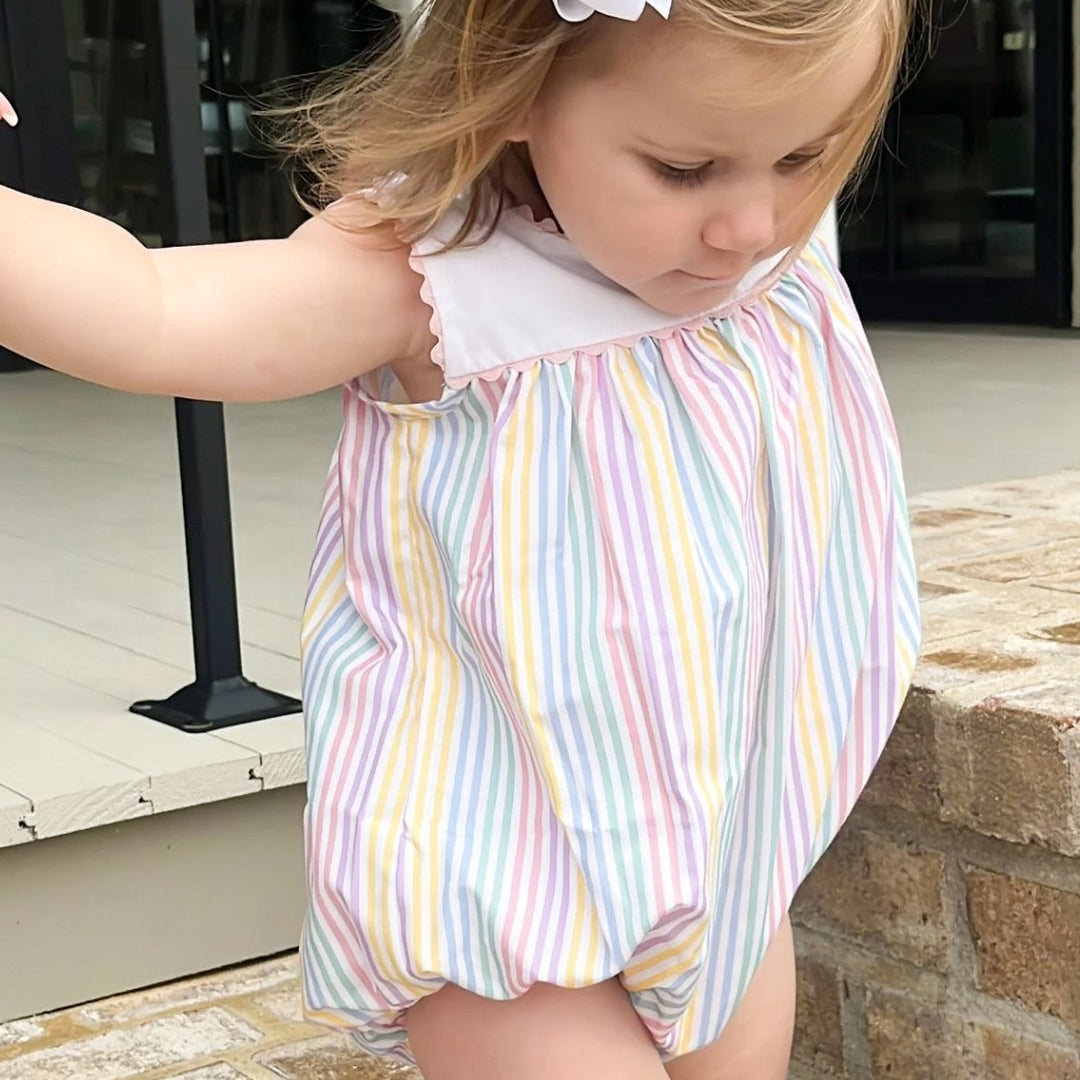 The Charming Bubble features a crisp white woven top paired with a custom Petunia Pinstripe bottom for a fresh and classic look. Designed with double buttons on the shoulders, and pink ric rac trim this timeless piece is both stylish and comfortable for your little one.