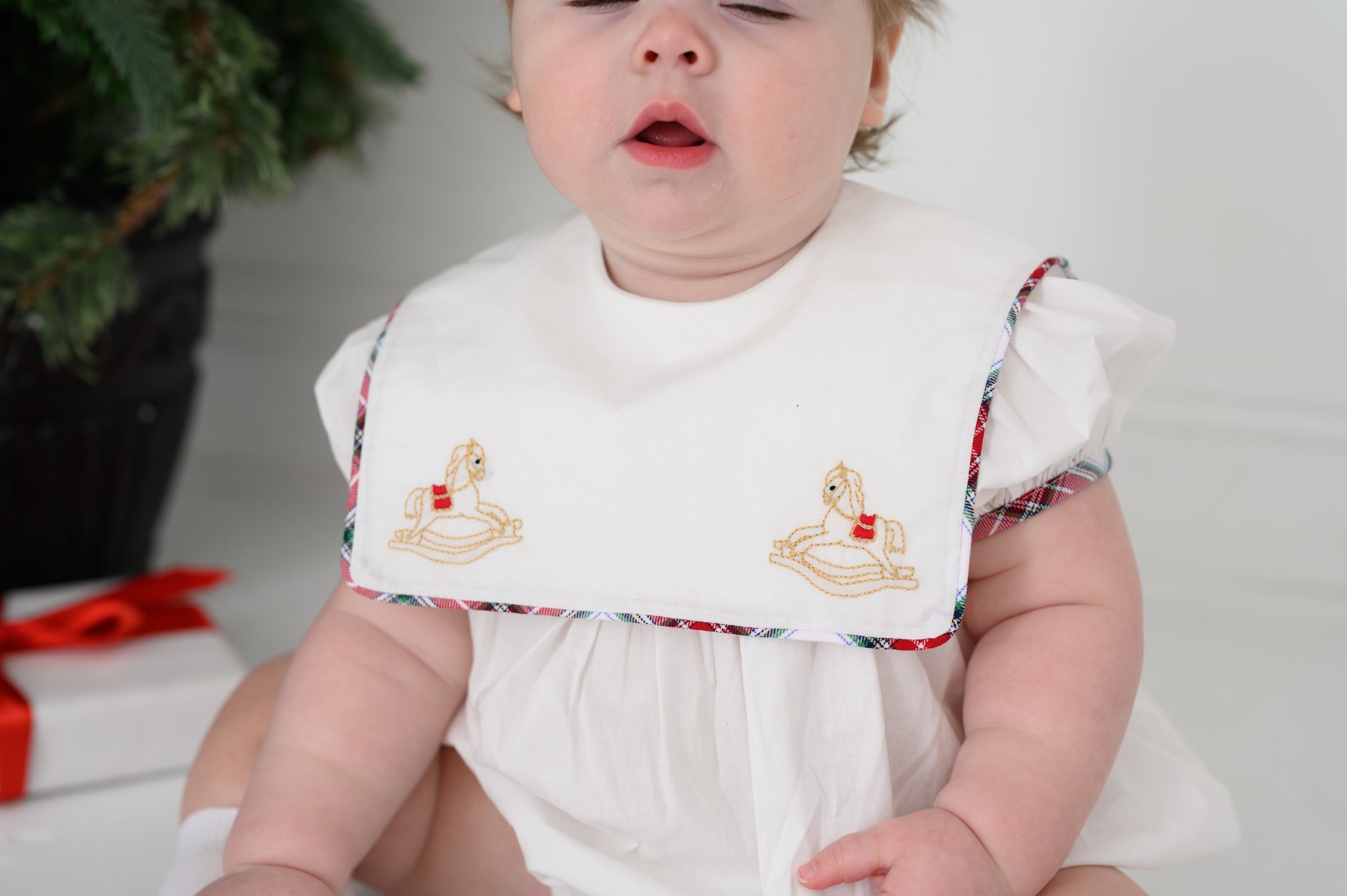 Our best selling Hope Chest Bubble is back this season and perfect for the holiday season. This Blessings White batiste bubble is trimmed in Highland Park Plaid and the square collar has the sweet detail of embroidered rocking horses. Your little girl will be the best dressed at all your holiday parties.