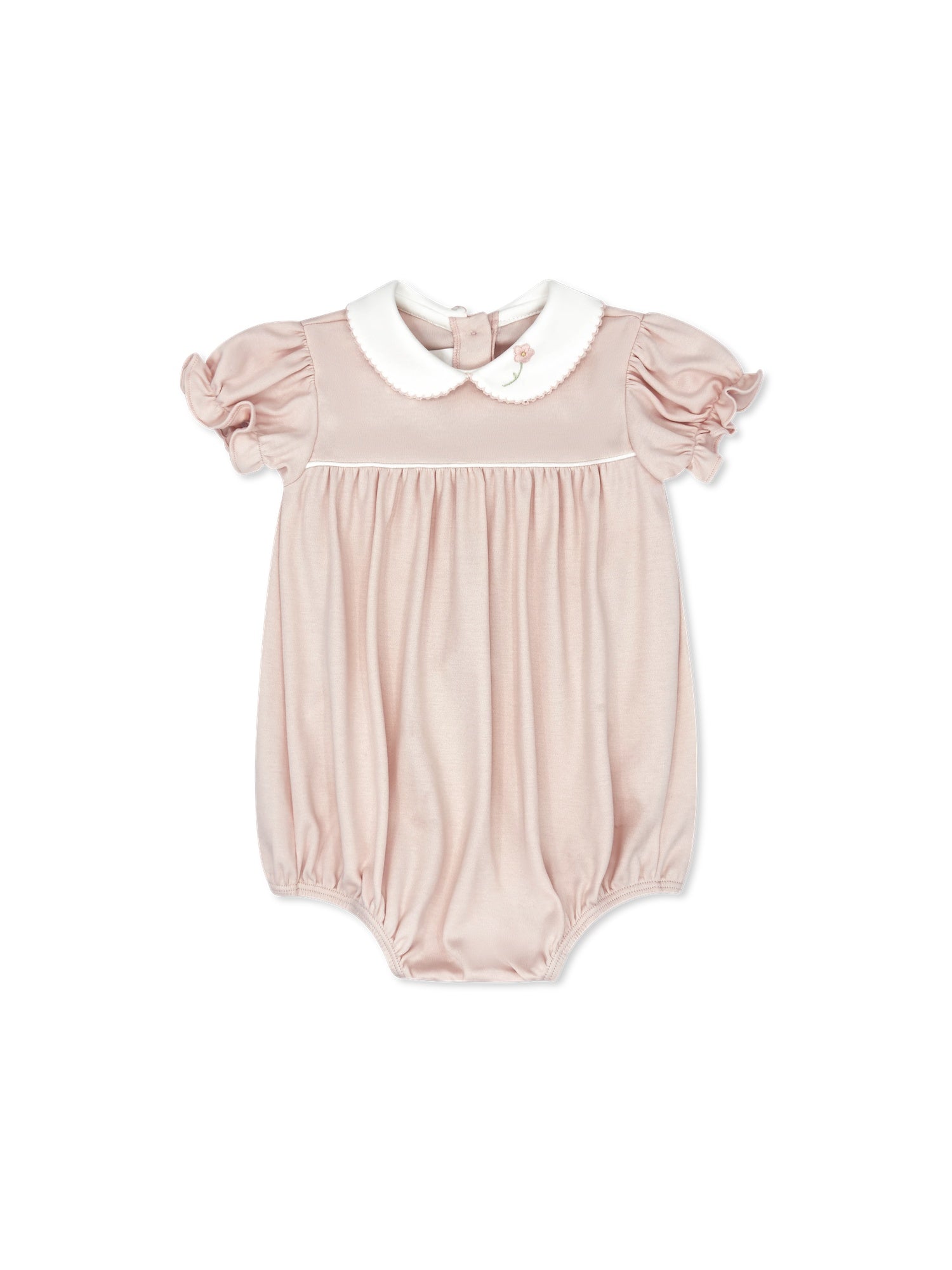 Delightfully classic, The Charleston knit bubble features Park Pink knit fabric, perfect for everyday wear or special occasions. The Peter Pan collar is beautifully detailed with a floral embroidery with pink picot trim.