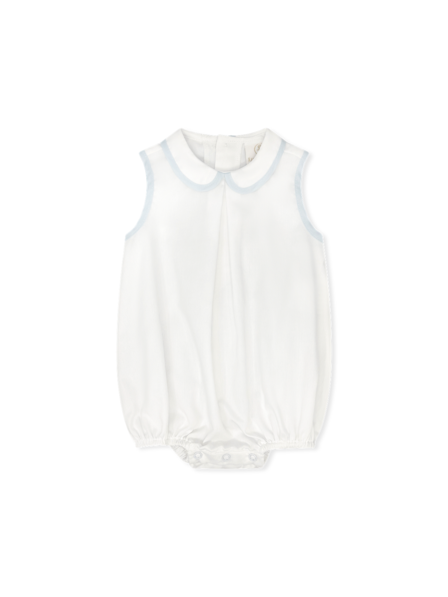 This sleeveless bubble features a crisp Peter Pan collar and delicate Blessings Blue piping at the collar and arm openings for a soft, tailored look. Perfect for warm days, special occasions, or everyday elegance.