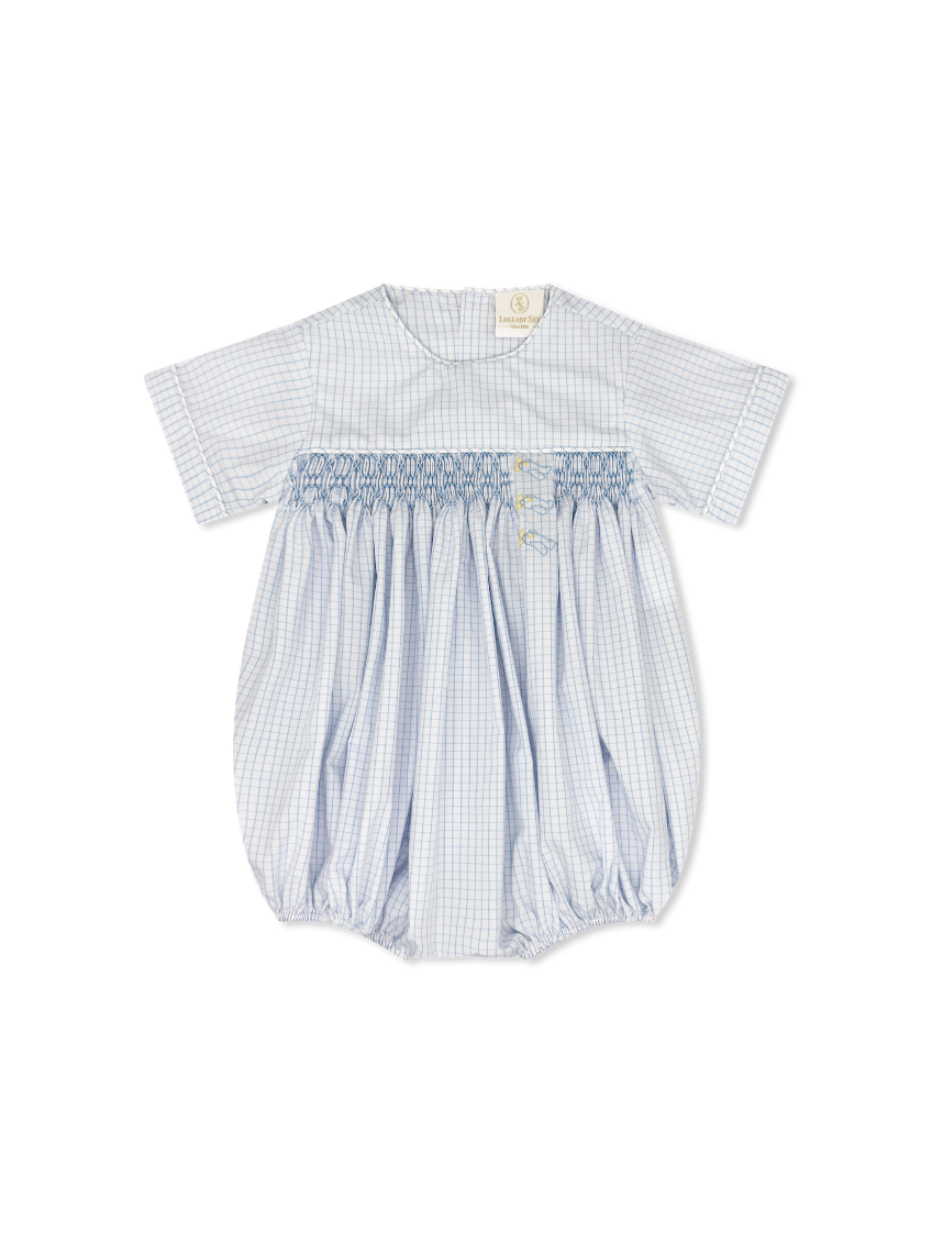 Take off in timeless style with the Hayes Bubble in Classic Blue Windowpane. This charming bubble features hand-smocked detailing across the chest with adorable airplane embroidery that's perfect for your little adventurer.