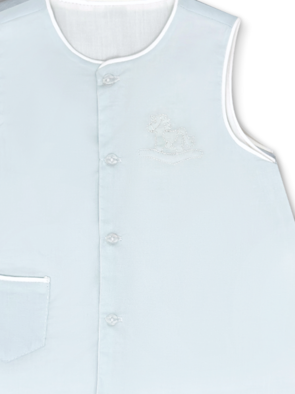 The Best Selling Mason Diaper Set in Blessings Blue Batiste is a timeless and charming choice for your little one. Adorned with a delicate rocking horse embroidery, this set combines classic elegance with a playful touch, making it perfect for newborns and special occasions.